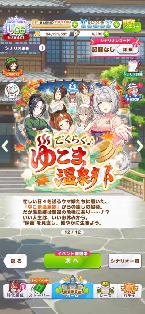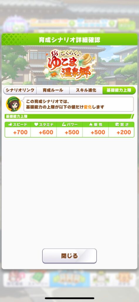 今回のシナリオの魅力ポイントですが、温泉券を使うと「温泉パワー」を使うことができ、トレーニングの効果をあげたりやる気を上げたり体力を回復することができます!育成目標を達成した後もステータスの伸びやすくなるので上手く使いこなせば効率よくトレーニングできます!更にお休みやお出かけでターンを消費することが無くなったりやる気ダウンにかかっても気にならなくなりますが賢さトレーニングで体力が回復しにくくなったり普段のトレーニングの体力消費が多くなるのがこのシナリオの若干デメリットです。あと「超回復」が使えるタイミングになれば体力が最大150まで回復できるので有効活用しておくといいですね!SSRのサポカ「保科健子」を装備に入れれば超回復や温泉券を獲得しやすくなるので個人的にはオススメです!