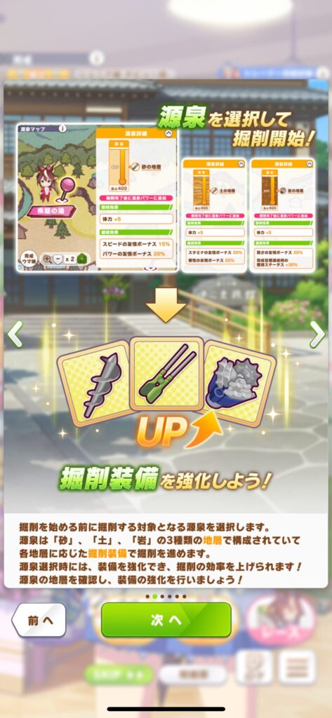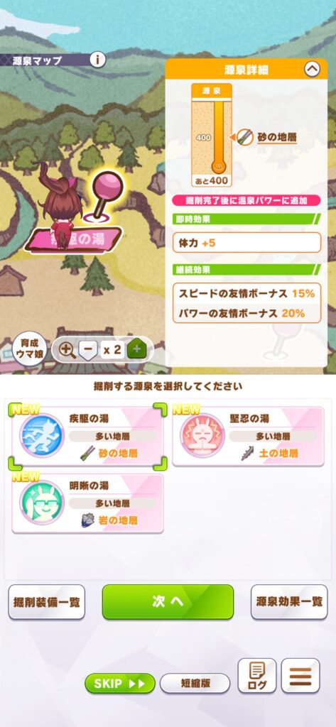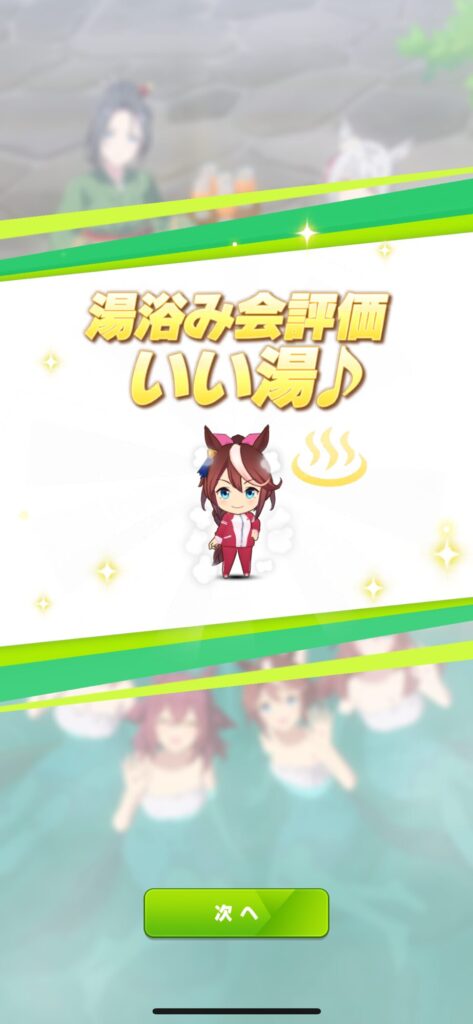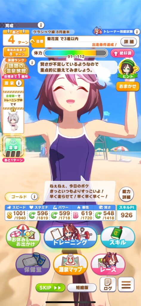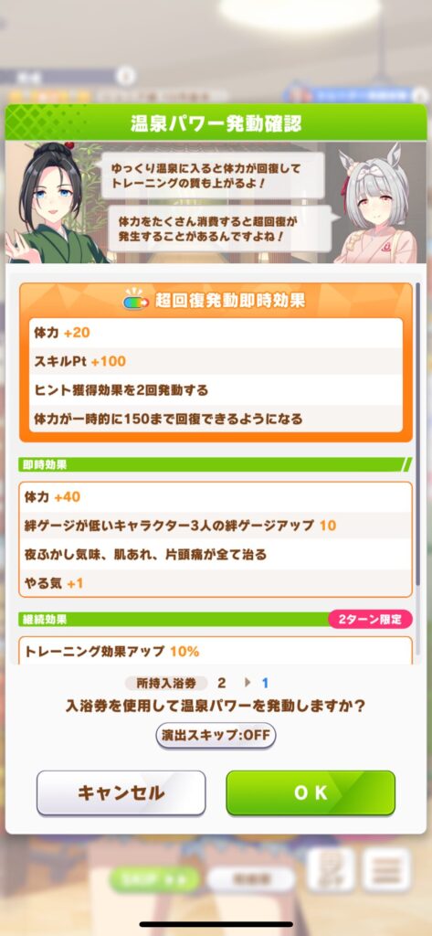 合宿の時は温泉パワーとトレーニングのチャンス!温泉券を極力残し温泉パワーを使った直後は2ターントレーニングに当てると良さそうです!