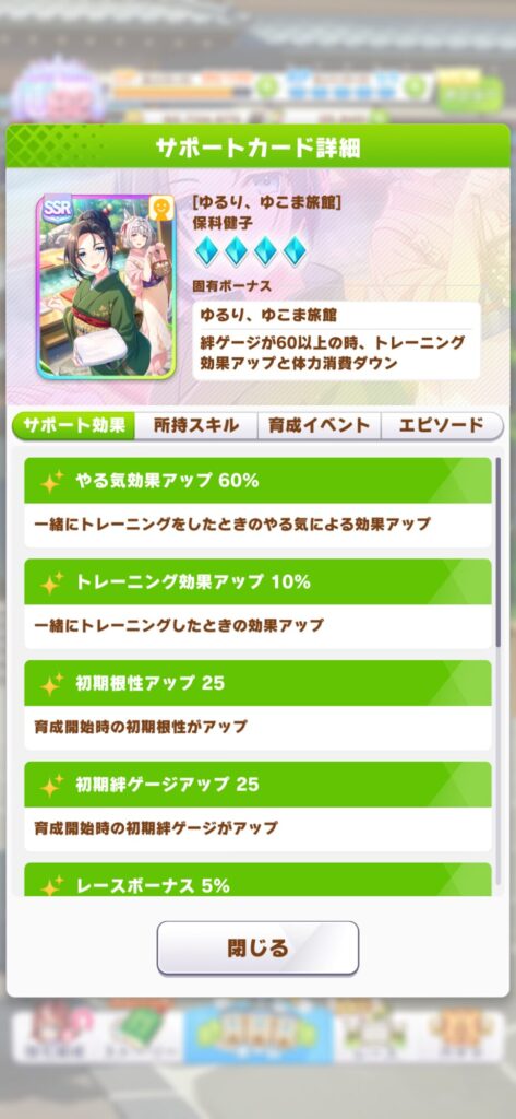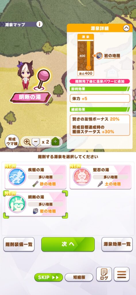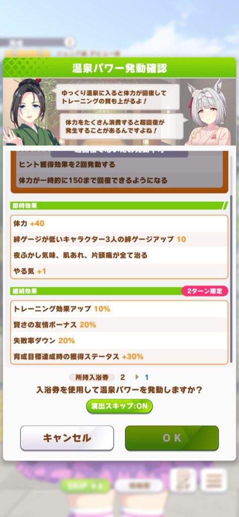 よく入浴券を温存しがちですが自身は合宿が迫りつつある4月あたりのタイミングで温泉パワーを発動しまくります!先述の女将さんのサポカイベントでも入浴券はもらえますが掘削作業が完了して入浴券がもらえるタイミングとも重なるので入浴念を無駄にしてしまうことがあります。なので4月~6月あたりで入浴券を使い切る勢いで温泉パワーを発動し合宿を迎えます!そしてさらに合宿でも入浴券が2枚もらえるのでガンガン使うのです!