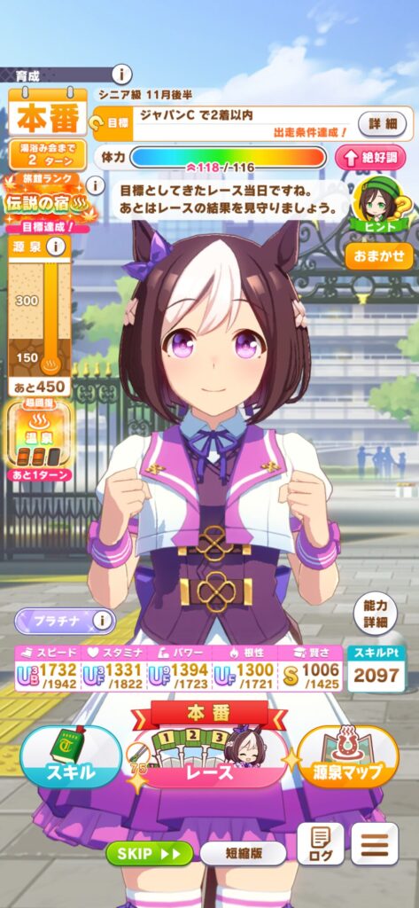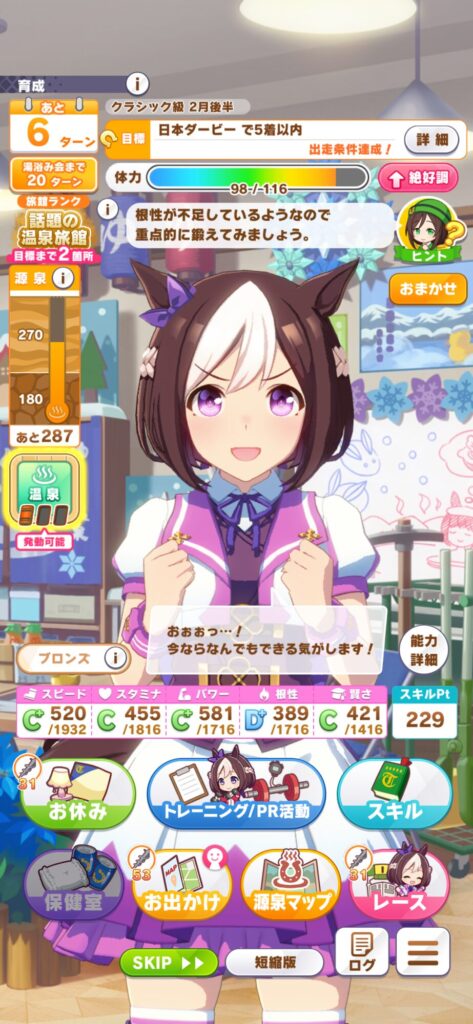 温泉パワーはただ体力ややる気を回復させトレーニング効果を上げたり失敗率を下げるなどトレーニングをしやすくするだけではなく目標を達成したらステータスが伸びやすくなります!なので目標レースの時は基本温泉パワーを使うようにしています!