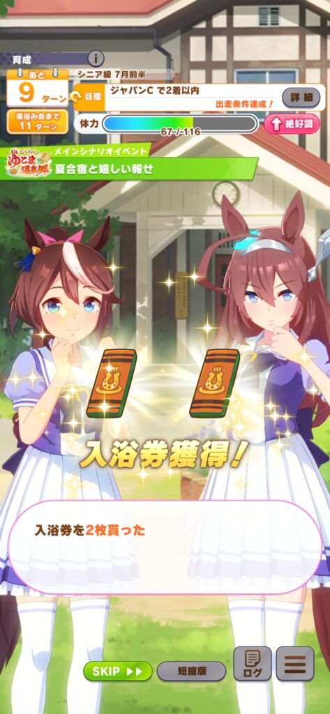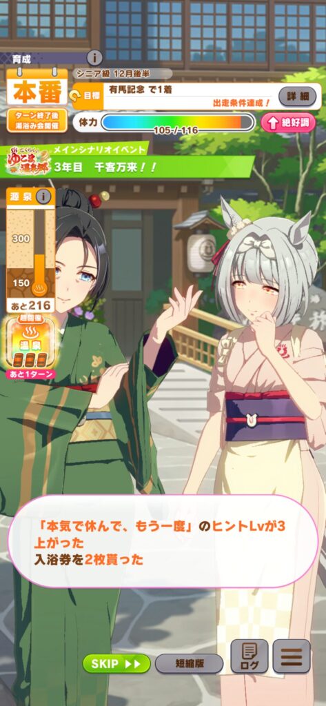 序盤は「お休み」は使って1回、もしくは運よく下のスクショのイベントが発生すれば使わずに温泉券を多くて2回使うようにしてタイミングを調整させます!