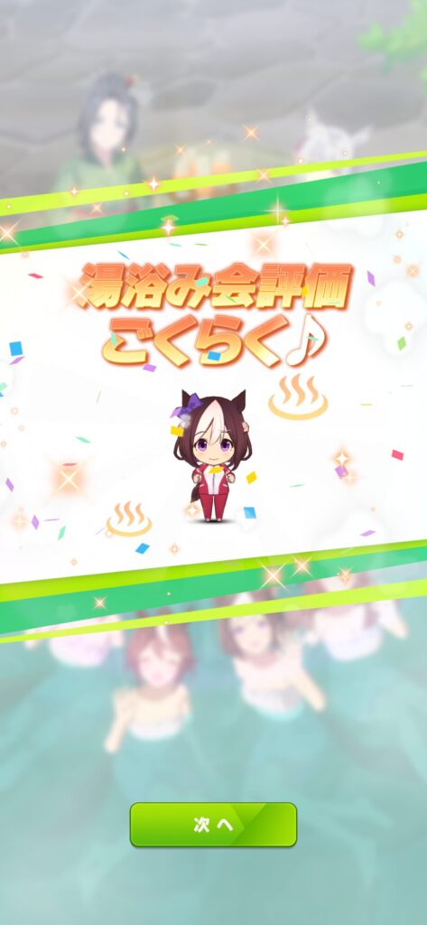 湯浴み会の評価が「ごくらく」までいけばあとは育成完了まで入浴チケットを使い切るだけ!進め方は前回の記事を参考あれ!